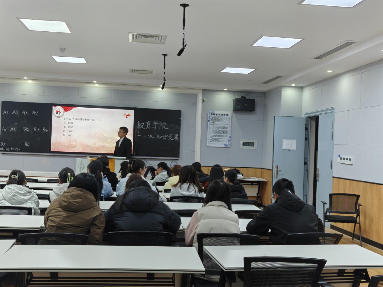 (本网讯:皮静冰)教育学院以爱国主义精神为引领,引导广大青年学子铭记历史、缅怀先烈,厚植家国情怀。学院团委于11月29日晚在学院精品录播室成功举办“一二·九”知识竞赛,全院学子踊跃报名、积极参与,共赴这场红色知识的盛宴。