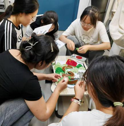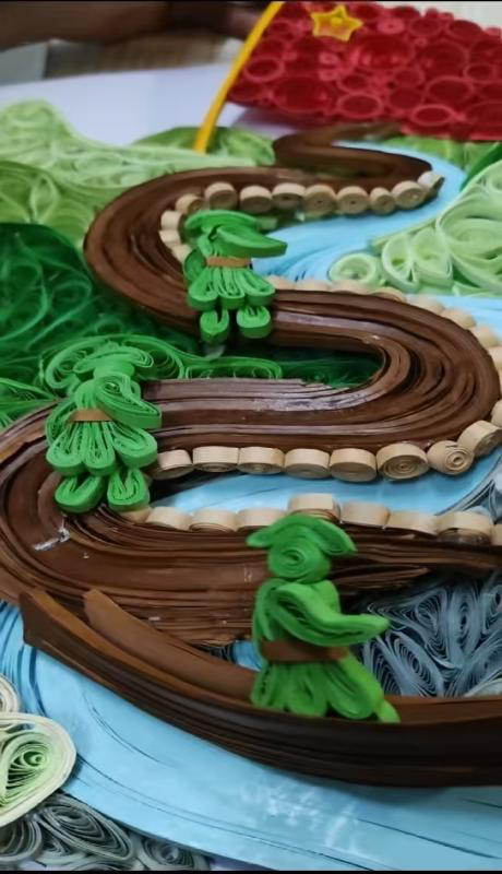 蒋宇莹:我们运用衍纸的卷、折、叠等工艺,细腻塑造出山川的层次、河流的动感与红军形象的鲜活感。不同深浅的绿色衍纸构建出立体山林,棕色衍纸缠绕成蜿蜒山路。作品生动再现了红军在长征途中不畏艰险、奋勇前行的场景,红色旗帜象征着信仰与希望,崎岖山路和复杂地形凸显长征的艰辛,让大家直观感受到革命先辈的坚毅精神,实现了艺术形式与红色主题的深度融合,是一件兼具审美价值与教育意义的优秀衍纸作品。
