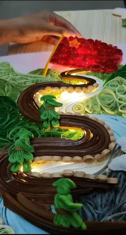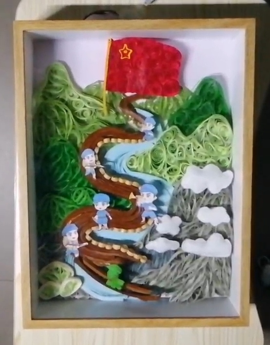 杨海薇:制作长征主题衍纸作品的过程,是我与红色历史对话的过程。卷折绿色纸卷塑山林、叠加灰色纸层摹雪山时,指尖触感让遥远的长征场景变得可触;调整红军小人姿态、粘贴红色螺旋军旗时,每一次打磨都是对“不畏艰险”精神的致敬。而特意在长征路途与红旗处加入的暖光,更像为这段征程烙下的注脚——这不仅是一场艰苦卓绝的跋涉,更是一条始终通向光明的希望之路。