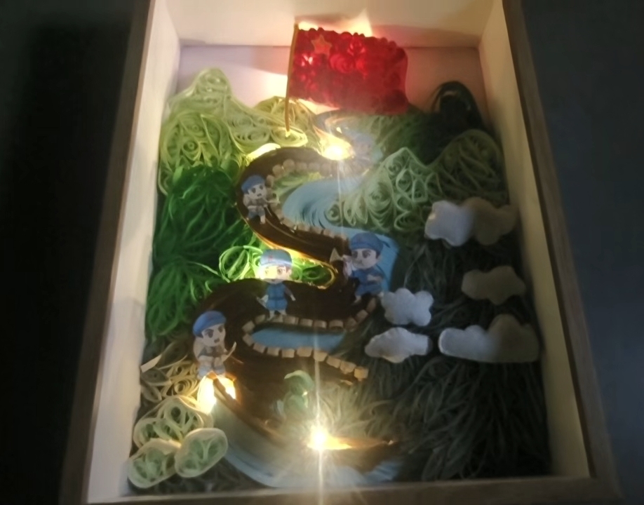在《衍纸卷韵里的长征史诗》中,绿色衍纸堆叠出山林的葱郁,是红军翻山越岭的底色;灰色衍纸与不织布塑出雪山的苍茫,复刻着“风雨侵衣骨更硬”的艰辛;蓝色衍纸蜿蜒成河,摹写着巧渡江河的壮烈;红色螺旋军旗以强烈的视觉张力,成为贯穿始终的信仰图腾。更藏着我们的小心思:道路中嵌入的暖光,既是长征的“希望之径”,也暗合着我们对八一起义“枪响破晓”、南湖红船“点亮未来”的向往——每一道纸痕,都是对红色精神的提前致敬。