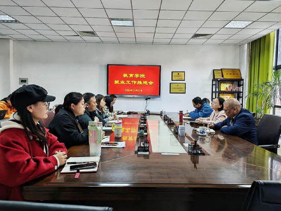 (本网讯:文|邓茜/图|金明针)为深入学习贯彻习近平总书记关于高校毕业生就业工作的重要指示批示精神,落实全国普通高校毕业生就业创业工作会议部署要求,教育学院于11月21日在党员活动室组织召开2026届毕业生就业工作推进会。教育学院党委书记李莉,院党委副书记、院长冯兵,副院长汪潇出席会议,会议由院党委副书记冯唐锴主持。