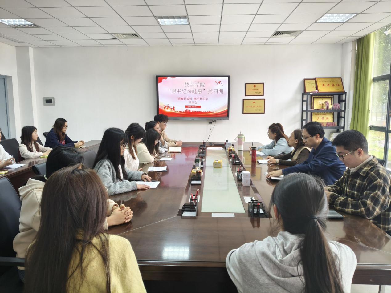 (本网讯:文|姜子欣/图|张嫒玉)为切实搭建学院与学生干部的沟通桥梁,倾听学生工作心声,助力学生骨干成长成才,4月8日上午,教育学院在党员活动室开展“跟书记来哇事”第四期座谈会,此次会议主题为“青春话成长,携手赴华章”,聚焦学生工作成长、工作建议与个人困惑等开展互动交流。教育学院党委书记李莉、院党委副书记冯唐锴,院学生科副科长兼团委副书记江霞琴,辅导员张凯强,以及院团委、学生会主要负责同学出席会议。江霞琴主持会议。