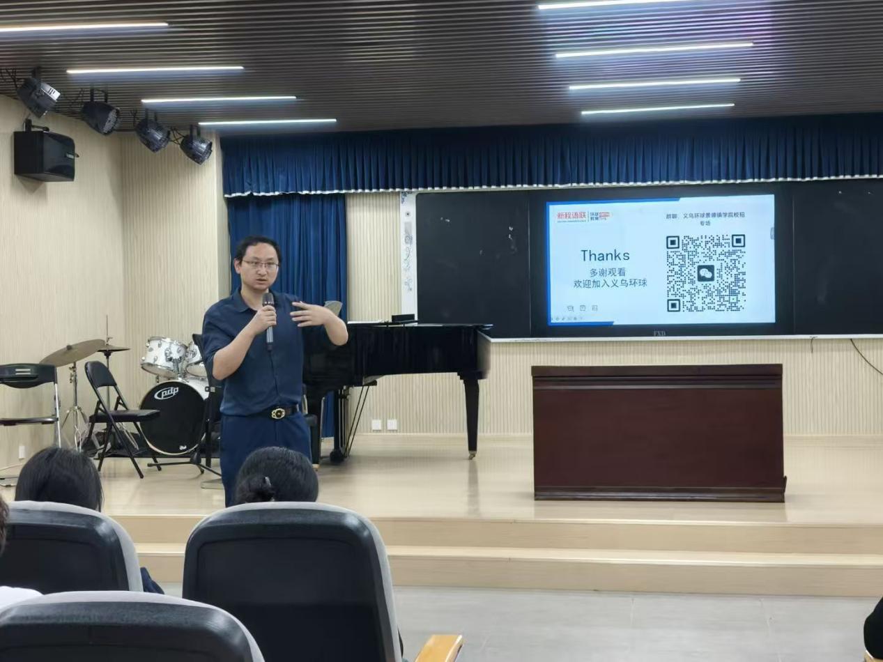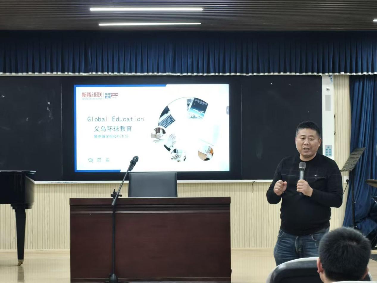随后,义乌市新程语联教育科技有限公司张胜兵老师围绕企业发展历程、办学规模、业务布局、业务生态与职业发展空间等内容进行了全面直观、深入立体的介绍。他梳理了企业多年来在教育领域的发展脉络,分享了从语言培训到多元业务拓展的升级之路,展示了全国校区布局、师资团队建设与标准化教学体系,结合义乌校区的运营成果,让同学们对企业的品牌实力、教学优势与发展空间有了更加全面直观的认识。