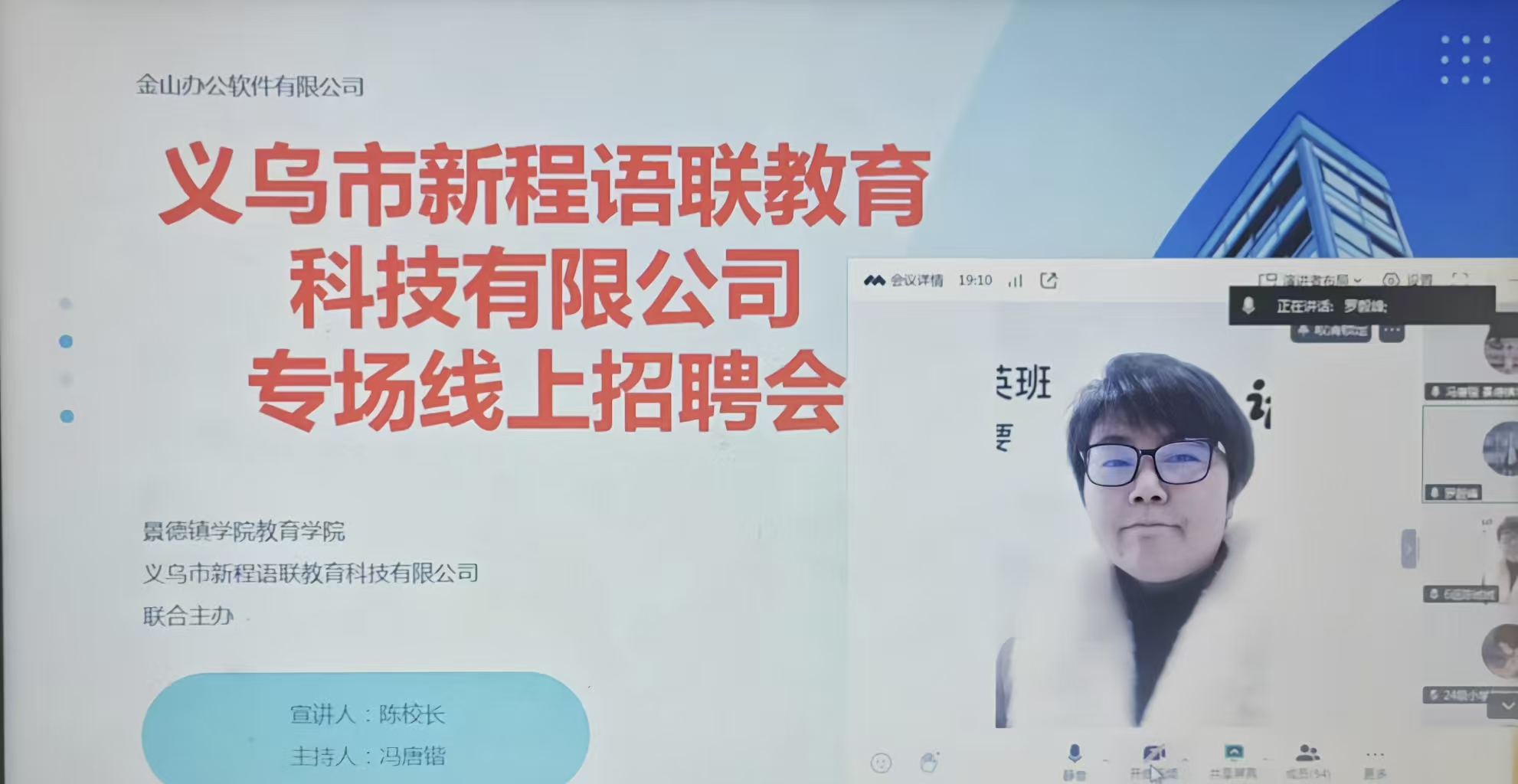 (本网讯:曾永琪)为搭建精准就业桥梁,助力学子职业启航,教育学院于2月4日邀请义乌市新程语联教育科技有限公司开展线上招聘宣讲会。教育学院党委副书记冯唐锴和辅导员罗毅峰出席了此次招聘会。