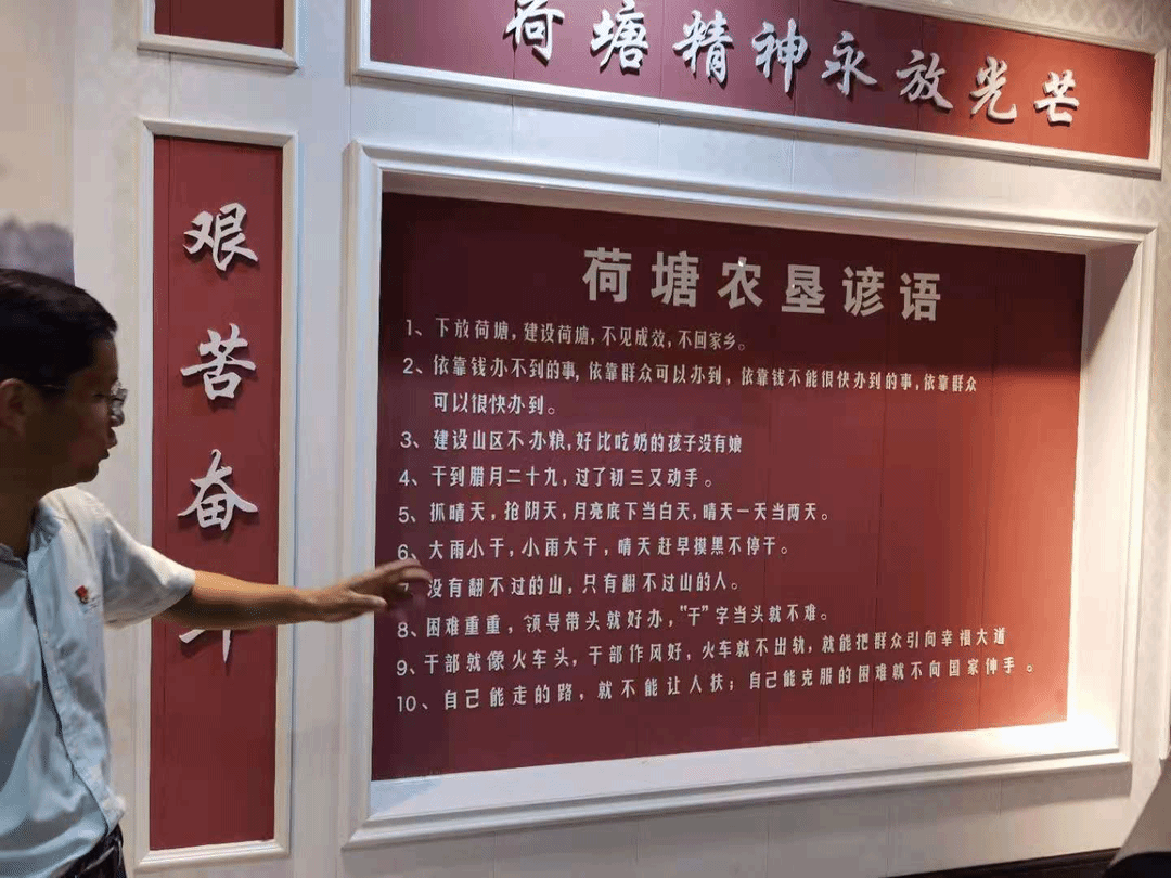 老一辈荷塘人在当时没房住、没菜吃、没生产工具的艰苦条件下,凭着坚韧不拔的毅力,特别是靠着“抓晴天、抢阴天,月亮底下当白天,晴天一天当两天”的拼搏精神,用竹子茅草搭棚子;木棍和红藤扎成铺,四角钉下木桩支成床;砍个竹筒当碗,劈根竹枝当筷,拿些盐水拌饭,自己动手做工具……战天斗地、自力更生,历时10年,硬是把山高水冷、地瘦土瘠的穷山沟,建设成了“社会主义时代的南泥湾”。1965年7月11日,《人民日报》报道了荷塘的先进事迹,号召全国人民向荷塘学习。