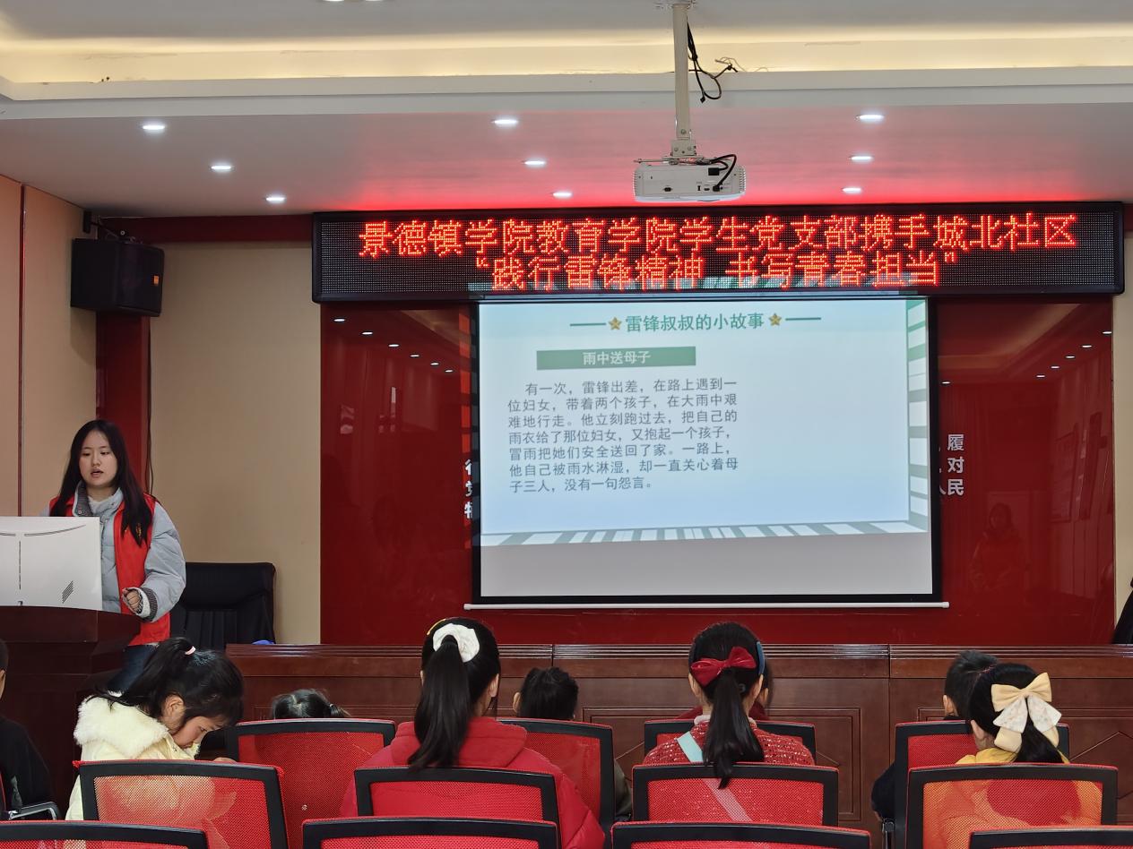 (本网讯:文|姜子欣/图|胡依美、姜子欣)为深入弘扬雷锋精神,引导青年学生党员以实际行动践行初心使命,推动雷锋精神走进基层、浸润童心,3 月 21 日上午,教育学院学生党支部联合浮梁县城北社区开展 “传承雷锋精神,书写时代担当” 主题党日活动,以宣讲+实践的形式搭建校社联动桥梁,让雷锋精神在社区落地生根、薪火相传。